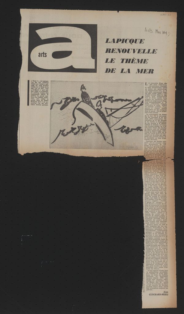 Απόκομμα, χαρτί ακανόνιστου μεγέθους, στα γαλλικά, δημοσίευσης κριτικής έκθεσης του Charles Lapicque, με θέμα τη θάλασσα. Σχολιάζεται η εικαστική του πορεία.
