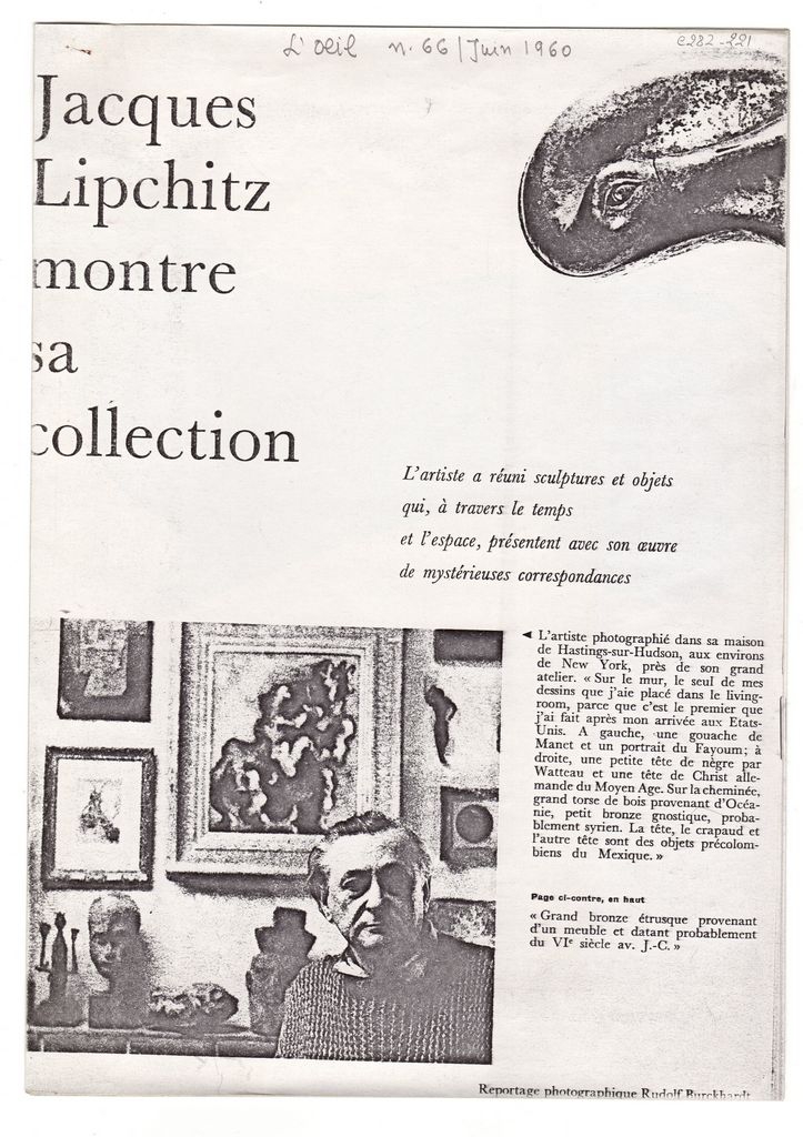 Φωτοαντίγραφο αποκόμματος, χαρτί, 5 φφ, 30×21 εκ., στα γαλλικά, δημοσίευσης αναφερόμενης στα έργα και αντικείμενα τέχνης που κατέχει στη συλλογή του ο Jacques Lipchitz. Αναγράφονται σχετικά σχόλια του καλλιτέχνη γι’ αυτά, καθώς και για τα δικά του έργα.