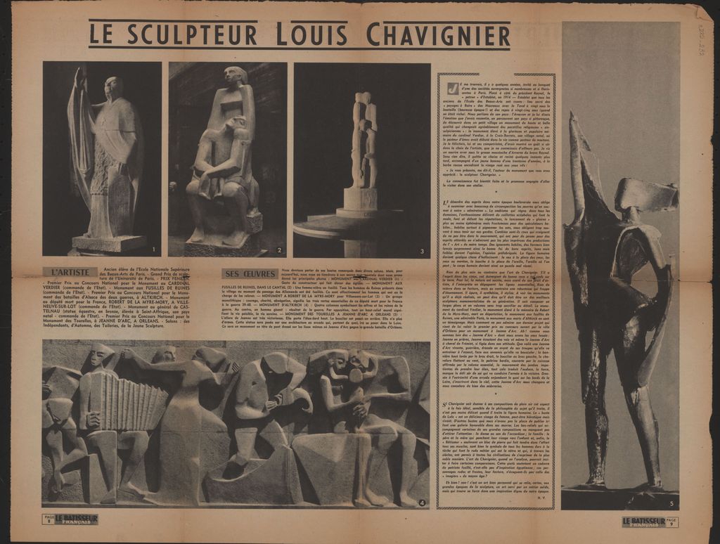Απόκομμα, χαρτί, στα γαλλικά, 42×56 εκ., δημοσίευσης κειμένου αφιερωμένου στον Louis Chavignier. Αναγράφονται βιογραφικές πληροφορίες για τον καλλιτέχνη, γίνεται αναφορά στις σπουδές του και σε έργα του και σχολιάζεται η γλυπτική του.