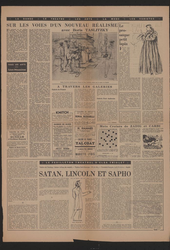 Στο ίδιο, “A travers les galeries- Calendrier des galeries”, αναφορά και κριτικές εκθέσεων της περιόδου των Tal Coat (Galerie de France), Mariette Lydis (Galerie Paul Ambroise), Knitch, Rina Rosselli, H. Hammes, Van Hasselt, J. Lurçat, Legueult, Fr. Bott, Goerg, Maria, J. Miro, Lucien Coutaud.