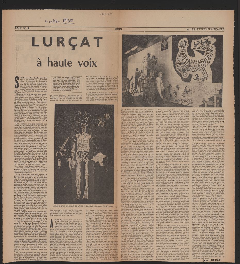Απόκομμα, χαρτί, 47×42 εκ., στα γαλλικά, δημοσίευσης κειμένου αφιερωμένου στον Jean Lurçat, με αναφορές στο εικαστικό του έργο και στο έργο του (ταπισερί) “Le Chant du Monde”. Το κείμενο προέρχεται από μονογραφία του Claude Faux με τον καλλιτέχνη, που ανέκυψε μετά από συνάντησή τους.