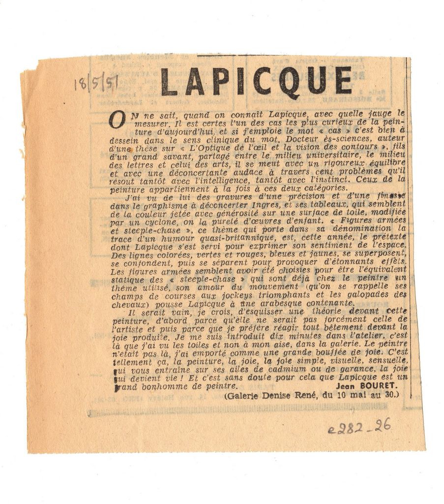 Απόκομμα, χαρτί, 13×13 εκ., στα γαλλικά, δημοσίευσης κριτικής έκθεσης του Charles Lapicque, η οποία διεξάγεται στην γκαλερί Denise René στο Παρίσι.