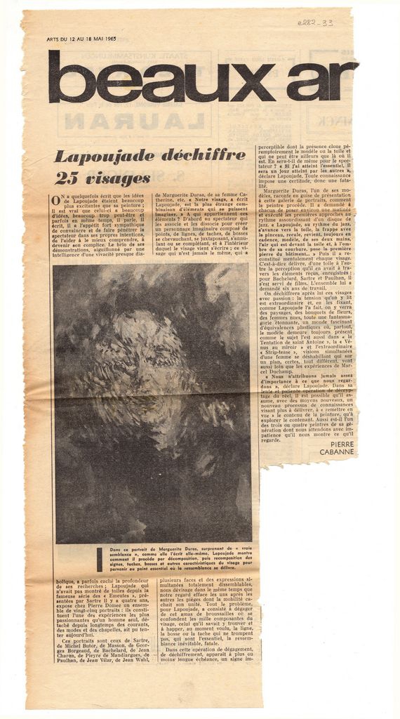 Απόκομμα, χαρτί ακανόνιστου μεγέθους, στα γαλλικά, δημοσίευσης κριτικής έκθεσης του Robert Lapoujade, η οποία διεξάγεται στην γκαλερί Pierre Domec στο Παρίσι. Παρουσιάζονται πορτραίτα τα οποία φιλοτέχνησε ο καλλιτέχνης.