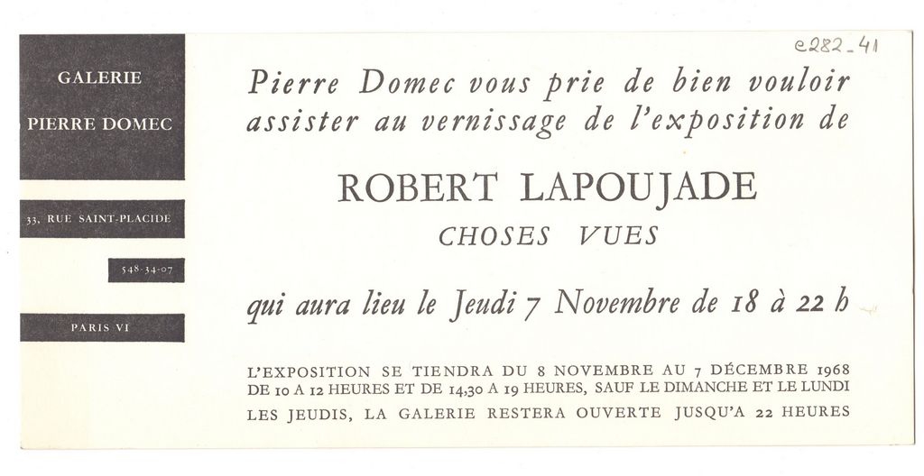 Πρόσκληση, χαρτόνι, 10×21.5 εκ., στα γαλλικά, έκθεσης του Robert Lapoujade, η οποία διεξάγεται στην γκαλερί Pierre Domec στο Παρίσι.
