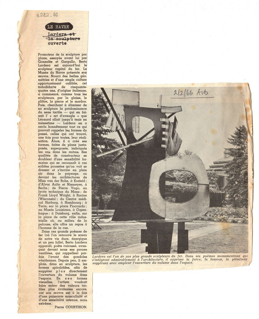 Απόκομμα, χαρτί ακανόνιστου μεγέθους, στα γαλλικά, δημοσίευσης κριτικής έκθεσης του Berto Lardera, η οποία διεξάγεται στην Havre. Αναγράφονται λεπτομέρειες και σχόλια για τα γλυπτά του.