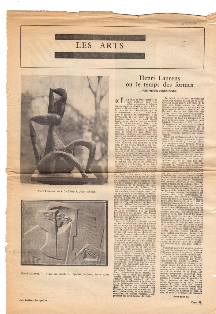 Απόκομμα, χαρτί διπλής όψης, 42×30 εκ., στα γαλλικά, δημοσίευσης άρθρου αναφερόμενου σε αναδρομική έκθεση Henri Laurens, η οποία διεξάγεται στο Grand Palais στο Παρίσι. Στην έκθεση παρουσιάζονται έργα του καλλιτέχνη, τα οποία δωρήθηκαν στο Μουσείο Σύγχρονης Τέχνης του Παρισιου. Αναγράφονται λεπτομέρειες για τη δωρεά και την έκθεση.