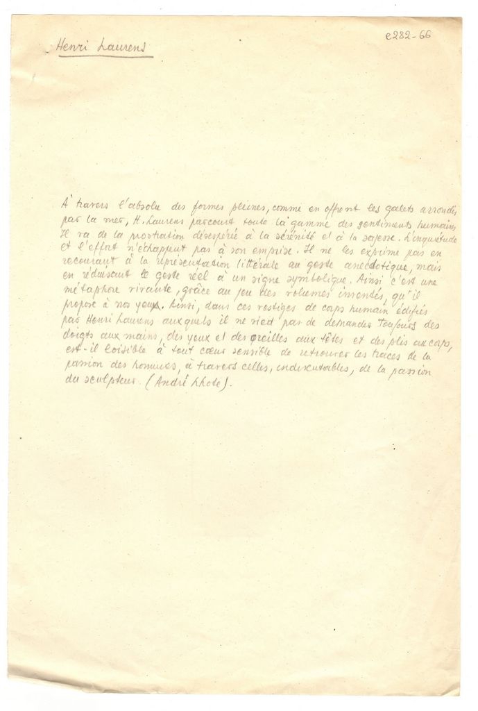 Χειρόγραφη με μολύβι στα γαλλικά, χαρτί, 30×21 εκ., αποδελτίωση κειμένου του André Lhote για τον Henri Laurens, από τον Τώνη Σπητέρη.