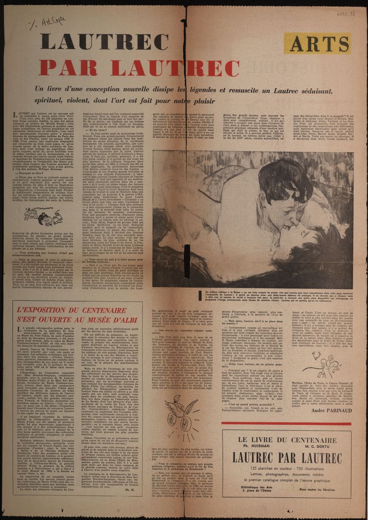 Απόκομμα, χαρτί, 60×42 εκ., στα γαλλικά, δημοσίευσης συνέντευξης του Ph. Huisman στην οποία αναφέρεται στην κυκλοφορία έκδοσης αφιερωμένης στον Toulouse Lautrec. Αναγράφονται λεπτομέρειες για την έκδοση και σχολιάζεται ο καλλιτέχνης.
