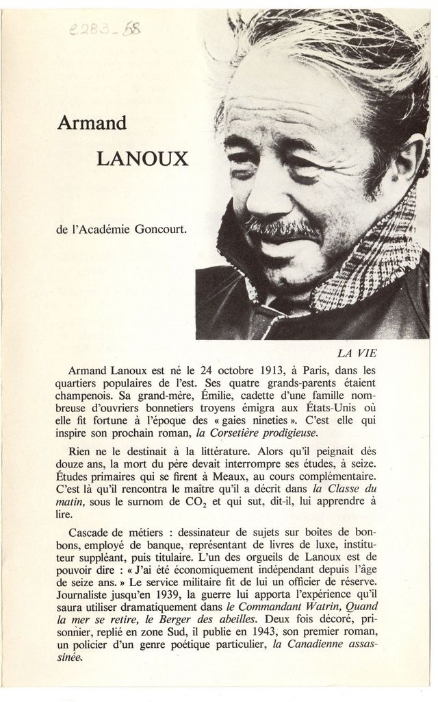 Έντυπο, στα γαλλικά, δίπτυχο, χαρτί, 19,2×12,2 εκ., αφιερωμένο στον Γάλλο συγγραφέα, ζωγράφο και δημοσιογράφο Armand Lanoux. Περιέχει βιογραφικά στοιχεία και αποσπάσματα κριτικών και αναφορών στο έργο του.