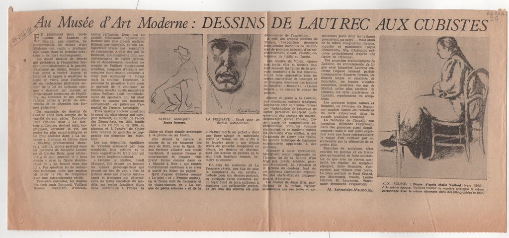 Απόκομμα, χαρτί, 19 x 42 εκ., στα γαλλικά, δημοσίευσης κριτικής ομαδικής έκθεσης ζωγραφικής (σχεδίου), η οποία διεξάγεται στο Μουσείο Μοντέρνας Τέχνης στο Παρίσι. Παρουσιάζονται έργα τα οποία χρονολογούνται από την περίοδο εικαστικής δημιουργίας του Toulouse Lautrec ως και τον κυβισμό. Το απόκομμα εικονογραφείται και φέρει επιγραφή.
