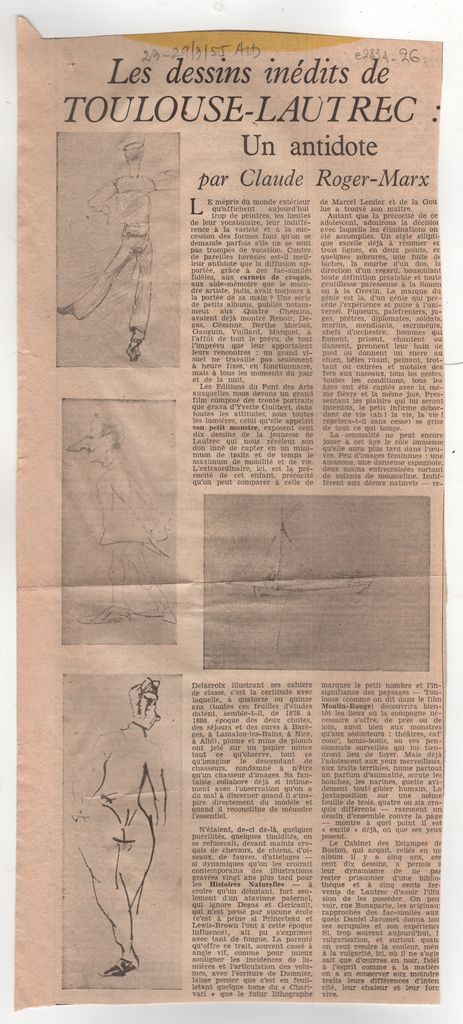 Απόκομμα, χαρτί, 2 φφ, 37 x 16 και 19 x 21 εκ., στα γαλλικά, δημοσίευσης άρθρου το οποίο αναφέρεται σε έκθεση άγνωστων σχεδίων του Toulouse Lautrec, η οποία διοργανώνεται στο Παρίσι και σε κυκλοφορία βιβλίου που συμπληρώνει το θέμα της έκθεσης. Το απόκομμα εικονογραφείται και φέρει επιγραφές.