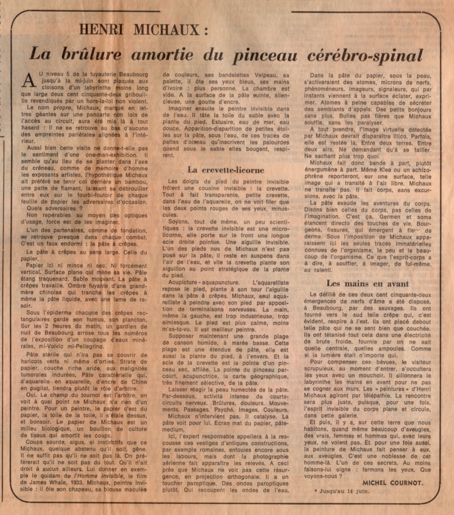 Απόκομμα, έντυπο, χαρτί, 50,0×33,2 εκ., όπου δημοσιεύεται, στα γαλλικά, άρθρο του Michel Cournot για την έκθεση έργων του Γάλλου ποιητή και εικαστικού καλλιτέχνη Henri Michaux, που διοργανώθηκε στο Παρίσι το 1978. Στην ίδια σελίδα δημοσιεύεται επίσης άρθρο της Geneviève Breerette με τίτλο “Malevitch: Fragments d’un grand oeuvre”. Στην άλλη όψη τρία άρθρα του Jean-François Chevrier “Écrits de K. Malicitch, le miroir suprématiste. La plume aiguë du peintre”, “W. Strzeminski – K. Kobro. L’Espace uniste. L’imagination du tableau”, “Rodtchenko, de German Karģirov. L’artiste ingénier” και σύντομο σημείωμα του G. B. για την έκθεση “Paris-Moscou”.