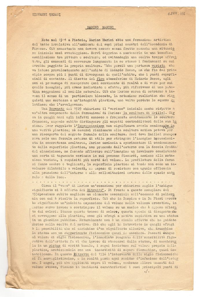 Κείμενο, στα ιταλικά, δακτυλόγραφο, χαρτί, 3 φφ., 33,7×22,0 εκ. Δοκίμιο του ιστορικού τέχνης Giovanni Urbani, Marino Marini, για τον Ιταλό γλύπτη. Πιθανόν κείμενο ομιλίας που πραγματοποιήθηκε στην Galleria Nazionale d’Arte Moderna στη Ρώμη το 1957.