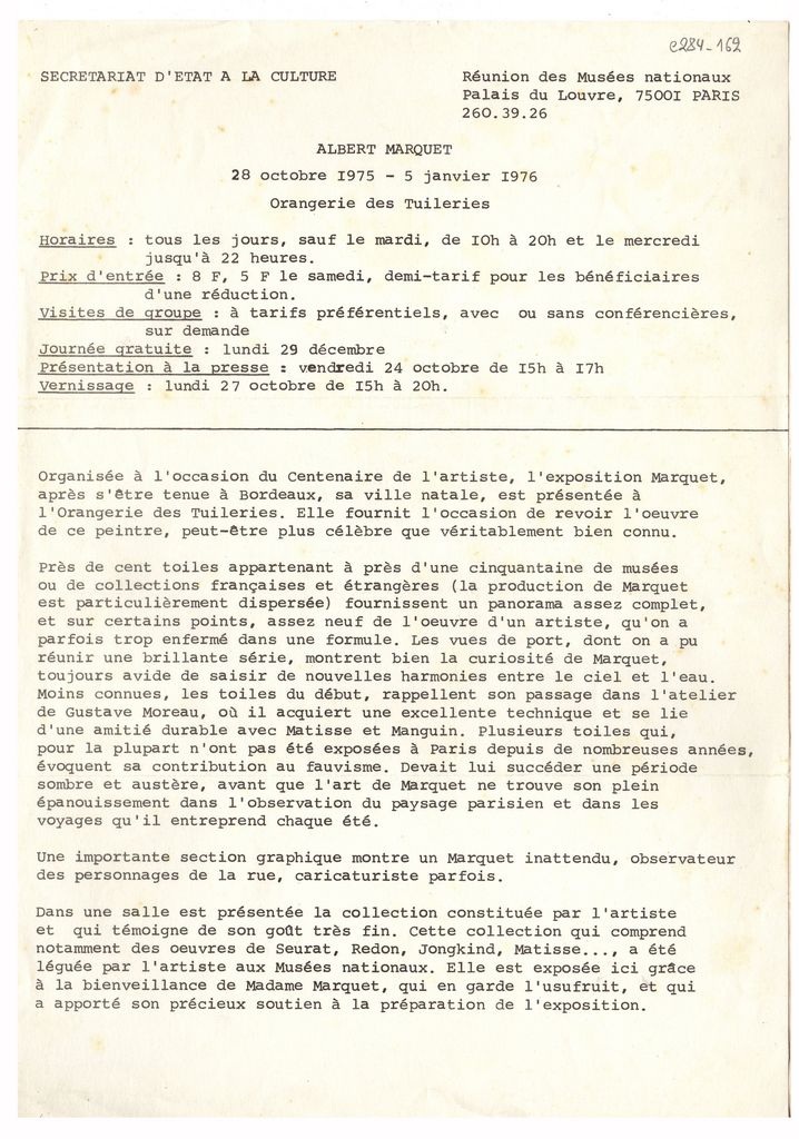 Κείμενο, δακτυλόγραφο, χαρτί, 28,9×20,3 εκ. Δελτίο τύπου της αναδρομικής έκθεσης έργων του Γάλλου ζωγράφου Albert Marquet που διοργανώθηκε στο Παρίσι το 1976.
