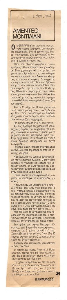 Απόκομμα, έντυπο, χαρτί, 2 τμήματα, 29,6×5,5 εκ., 13,5×5,5 εκ., όπου δημοσιεύεται, στα ελληνικά, άρθρο για τη ζωή του Ιταλού ζωγράφο Amedeo Modigliani.