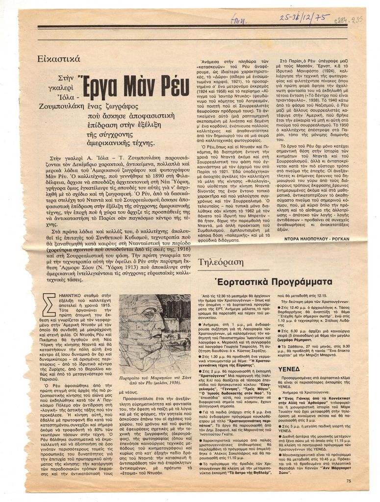 Απόκομμα, έντυπο, χαρτί, 33,4×24,0 εκ., όπου δημοσιεύεται, στα ελληνικά, κριτικό σημείωμα της Ντόρας Ηλιοπούλου-Ρογκάν για την ατομική έκθεση έργων του Αμερικανού εικαστικού καλλιτέχνη Man Ray που πραγματοποιήθηκε στην Αθήνα το 1975. Επάνω επιγραφή με τα στοιχεία της δημοσίευσης. Στην άλλη όψη αναγγελίες εκθέσεων της περιόδου.