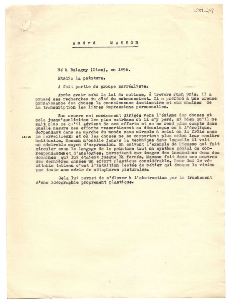 Κείμενο, δακτυλόγραφο, στα γαλλικά, χαρτί, 29,0×21,7 εκ. Βιογραφικά στοιχεία για τον Γάλλο σουρεαλιστή εικαστικό καλλιτέχνη André Masson. Δίνονται στοιχεία για το έργο του.