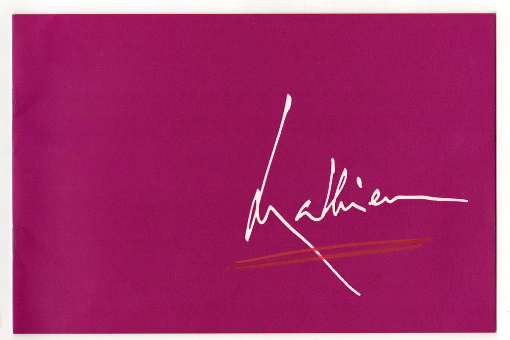 Έντυπο, στα αγγλικά, γερμανικά, χαρτόνι και χαρτί, 16,0×24,0 εκ. Κατάλογος της ατομικής έκθεσης έργων του Γάλλου ζωγράφου Georges Mathieu που πραγματοποιήθηκε στη Ζυρίχη και στη συνέχεια στο Λονδίνο το 1968. Περιέχει σύντομο βιογραφικό καλλιτέχνη, κατάλογο των έργων της έκθεσης