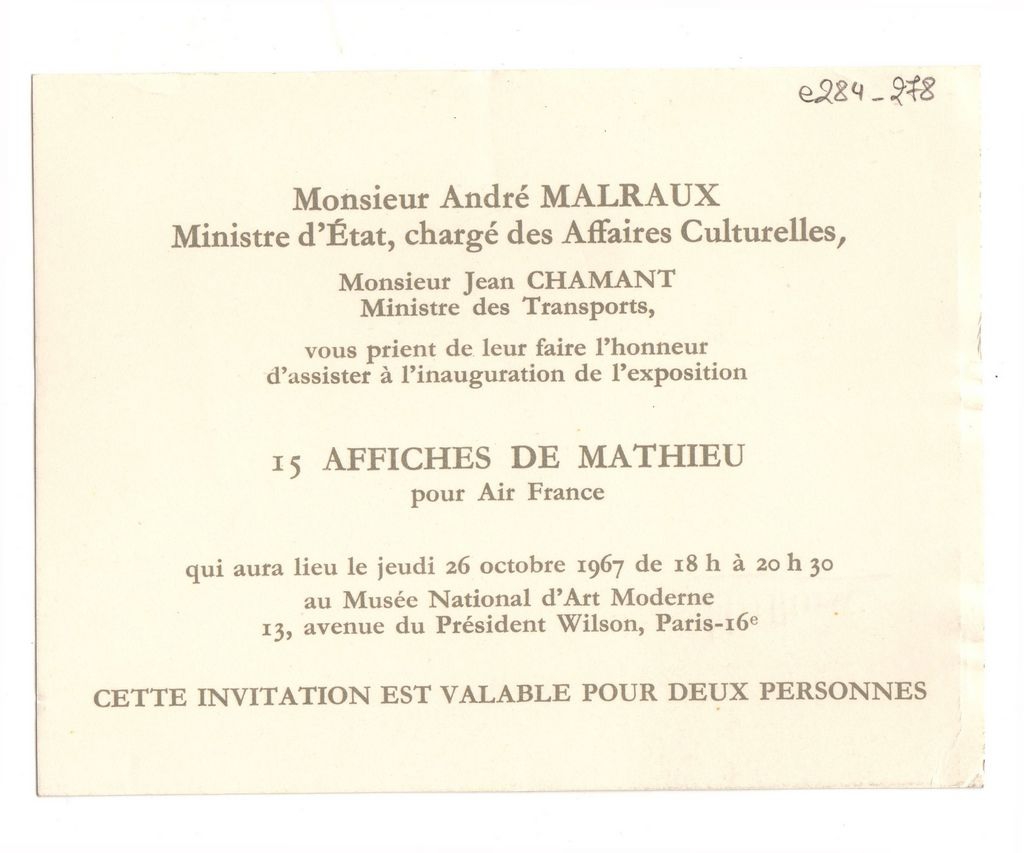 Έντυπο, στα γαλλικά, μονόφυλλο, χαρτόνι, 10,5×14,0 εκ. Πρόσκληση εγκαινίων της έκθεσης αφίσας που φιλοτέχνησε ο Georges Mathieu για την αεροπορική εταιρεία Air France που πραγματοποιήθηκε στο Παρίσι το 1967. Στην πίσω όψη, επιγραφή.