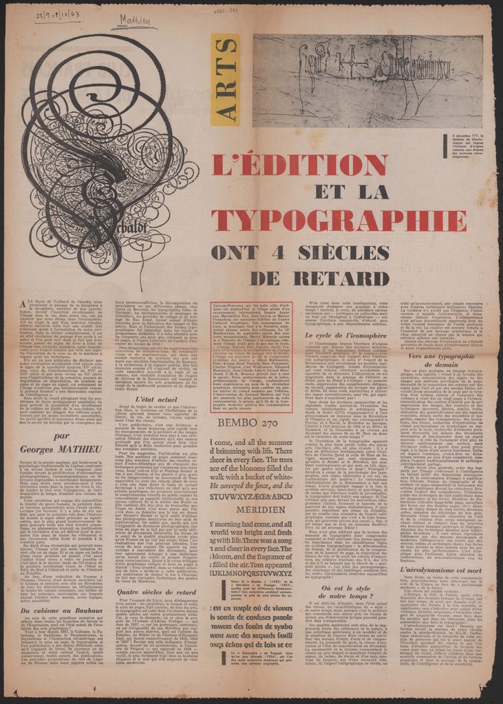 Απόκομμα, έντυπο, χαρτί, όπου δημοσιεύεται, στα γαλλικά, άρθρο του εικαστικού καλλιτέχνη Georges Mathieu σχετικά με τις εκδόσεις και την τυπογραφία. Επάνω, επιγραφή.