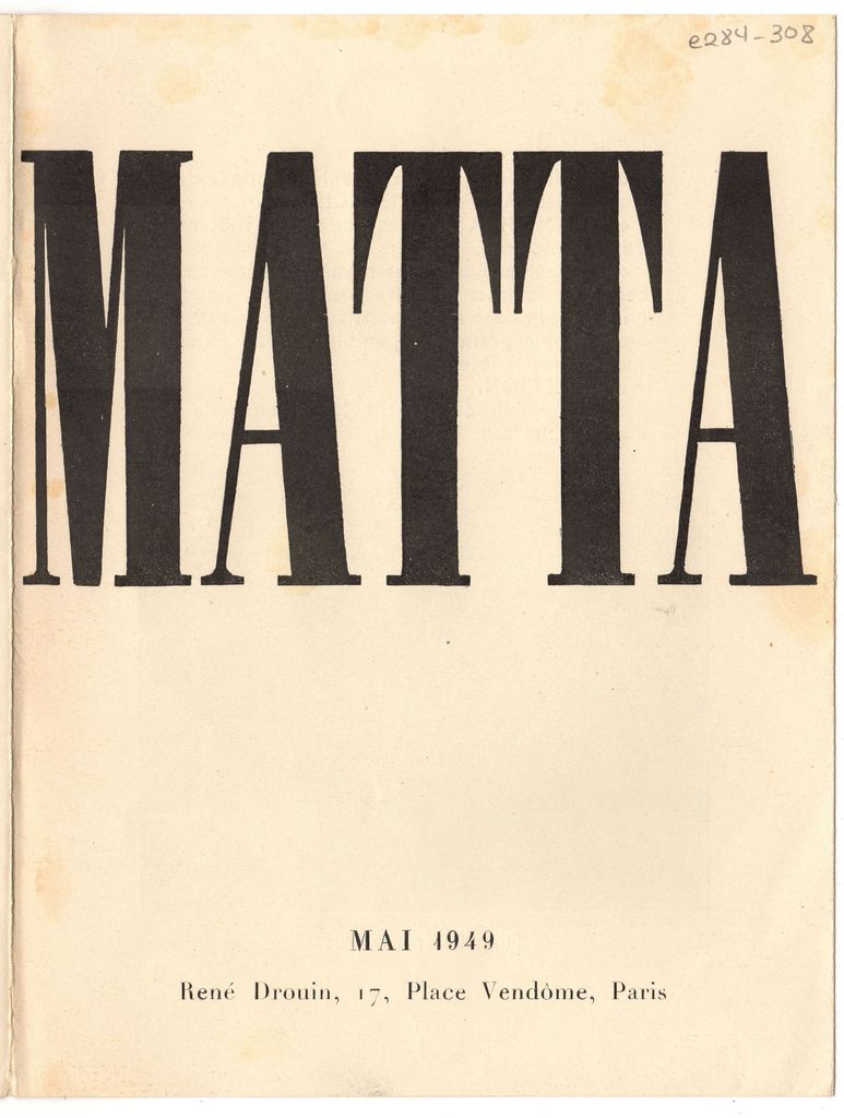 Έντυπο, στα γαλλικά, τετράπτυχο, χαρτί, 21,2×16,2 εκ.Φυλλάδιο της ατομικής έκθεσης του Roberto Matta που πραγματοποιήθηκε στο Παρίσι τον Μάιο του 1949. Περιέχει κείμενα του Michel Tapié με τίτλο “Note d’histoire” και κείμενο για τον καλλιτέχνη του J. Le Forojulien.