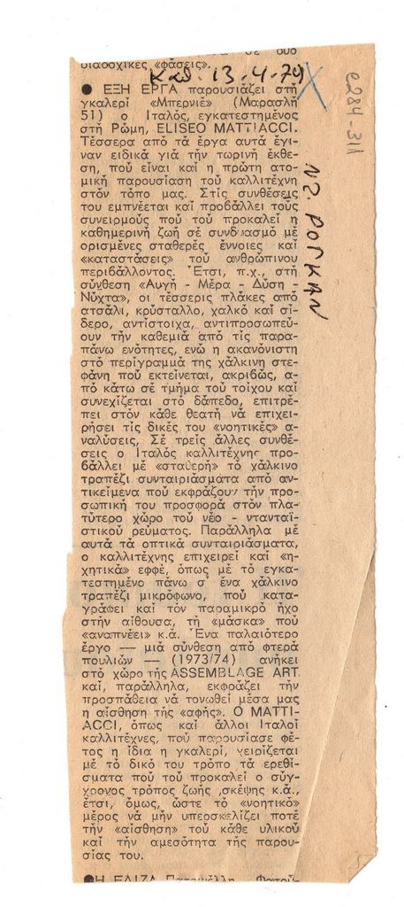Απόκομμα, έντυπο, χαρτί, 17,5×6,5 εκ., όπου δημοσιεύεται, στα ελληνικά, κριτική της Ντόρας Ηλιοπούλου-Ρογκάν για την ατομική έκθεση έργων του Ιταλού γλύπτη Eliseo Mattiacci που διοργανώθηκε στην Αθήνα το 1979. Επάνω και δεξιά, επιγραφή με τα στοιχεία της δημοσίευσης.