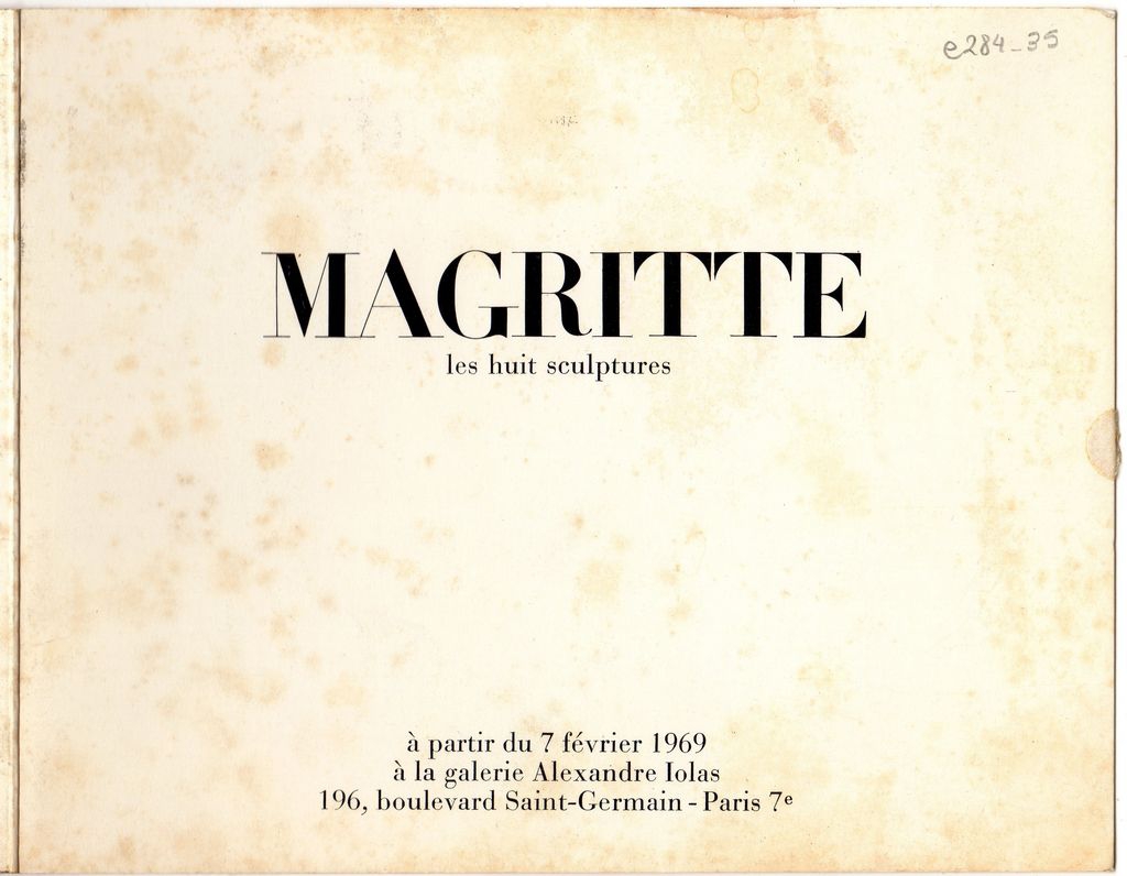 Έντυπο, στα γαλλικά, δίπτυχο, χαρτόνι ιλουστρασιόν, 13,6×17,5 εκ. Πρόσκληση εγκαινίων έκθεσης έργων γλυπτικής του René Magritte που πραγματοποιήθηκε στο Παρίσι το 1969. Συνοδεύεται από φάκελλο ταχυδρομείου, όπου επικολλημένη ετικέτα με δακτυλόγραφα τα στοιχεία της Μπέλλας Ραφτοπούλου στο Παρίσι. Σφραγίδα γαλλικού ταχυδρομείου.