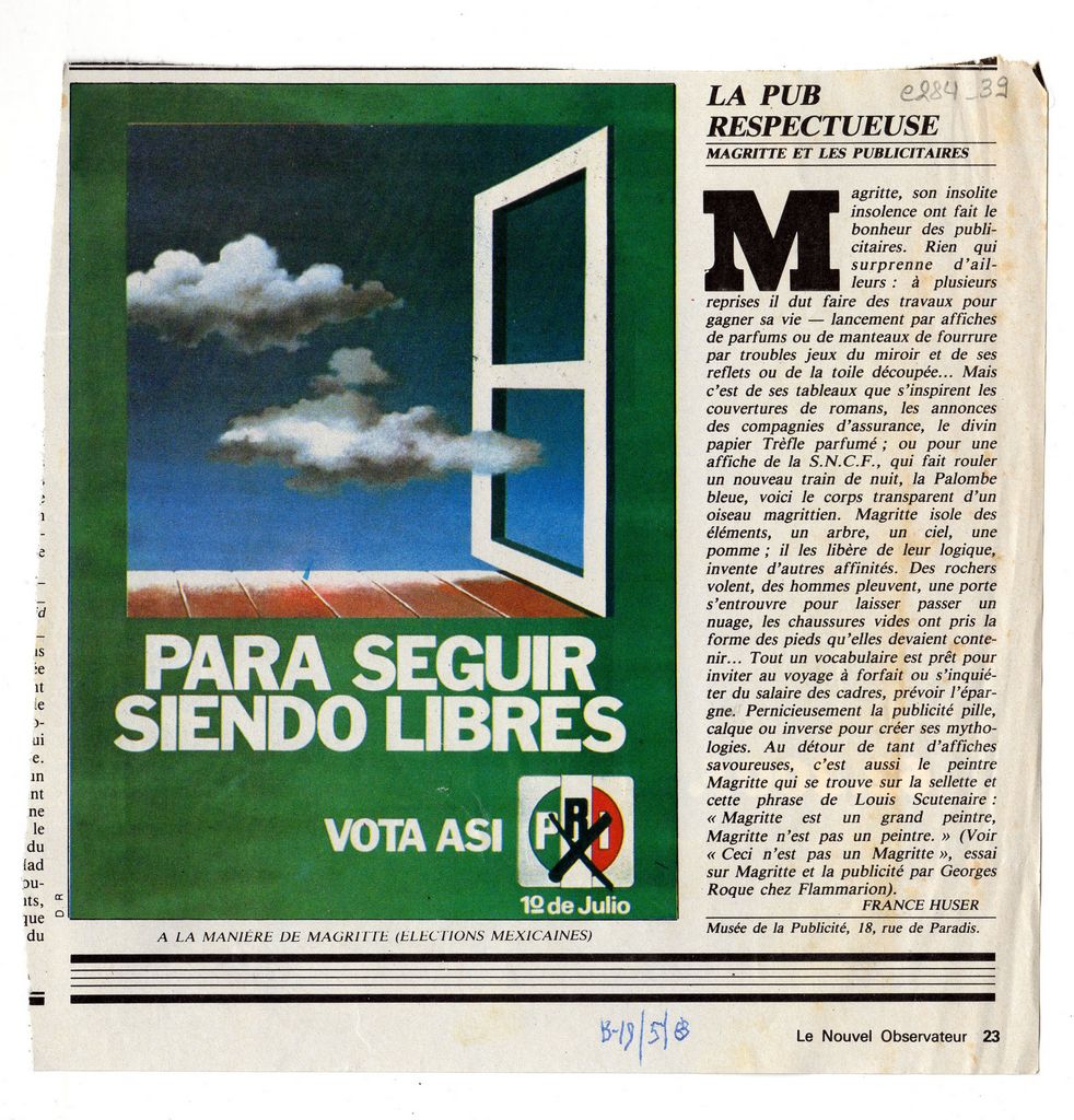 Απόκομμα, έντυπο, χαρτί ιλουστρασιόν, 17,0×17,2 εκ., όπου δημοσιεύεται, στα γαλλικά, σύντομο άρθρο του France Huser για την επιρροή του έργου του συμβολιστή ζωγράφου René Magritte στη διαφήμιση τη διοργάνωση έκθεσης με αυτό το θέμα στο Παρίσι το 1983. Κάτω, επιγραφή με την ημερομηνία της δημοσίευσης.