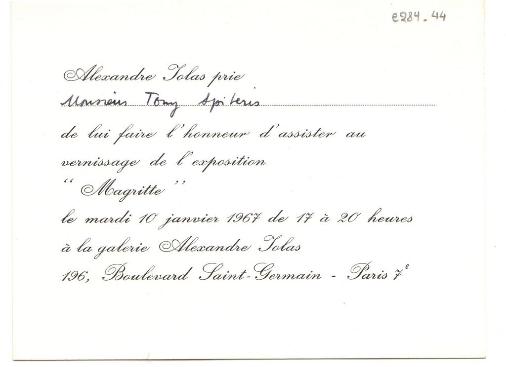 Έντυπο, στα γαλλικά, μονόφυλλο, χαρτόνι, μία όψη, 12,5×16,6 εκ. Πρόσκληση εγκαινίων της έκθεσης έργων του εικαστικού René Magritte που πραγματοποιήθηκε στο Παρίσι τον χειμώνα του 1967. Στην επιφάνεια της πρόσκλησης επιγραφή με το όνομα του Τώνη Σπητέρη ως παραλήπτη.