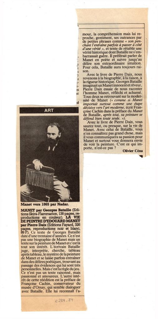 Απόκομμα, έντυπο, χαρτί, 28,3×12,3, όπου δημοσιεύεται, στα γαλλικά, βιβλιοκρισία του Olivier Céna για τις εκδόσεις των βιβλίων τέχνης του Georges Bataille με τίτλο “Manet’ (Editions Skira-Frammarion, 1955) και Pierre Daix με τίτλο “La vie de peintre d’Edouard Maet” (Editions Fayard, 1983).