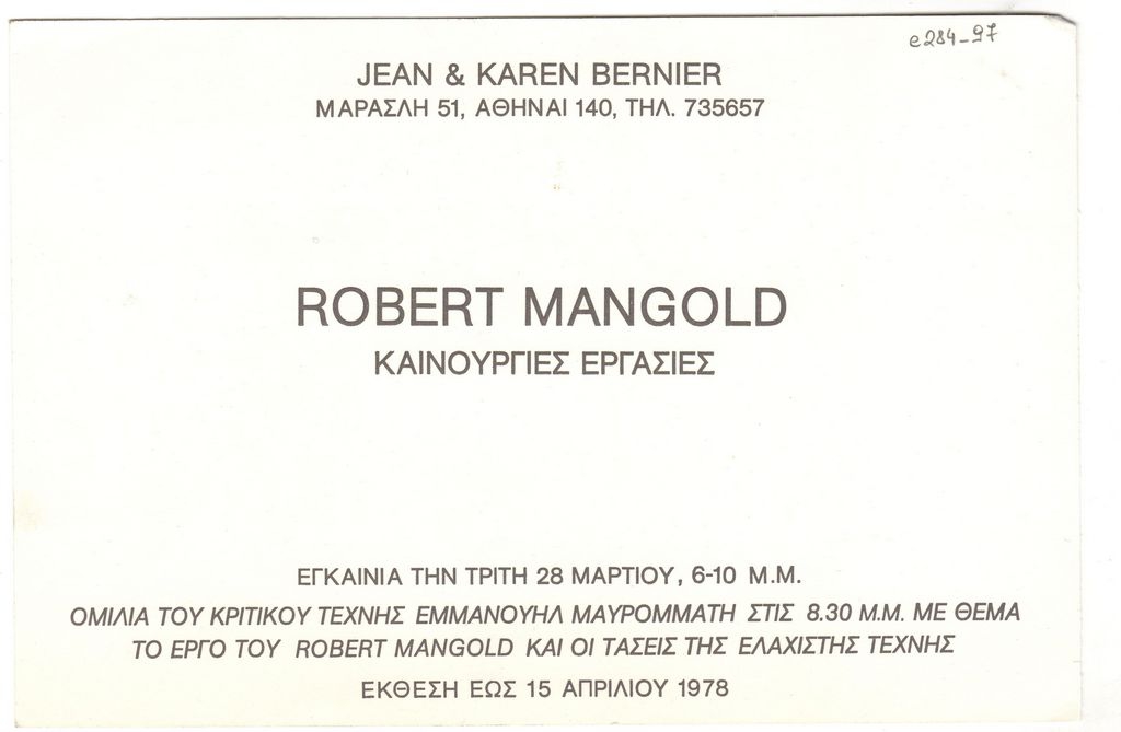 Έντυπο, μονόφυλλο, χαρτόνι, 14,1×21,1 εκ. Πρόσκληση της ατομικής έκθεσης έργων του Robert Mangold που πραγματοποιήθηκε στην Αθήνα το 1978. Στα εγκαίνια της έκθεσης πραγματοποίησε ομιλία για τον μινιμαλισμό στο έργο του καλλιτέχνη ο Εμμανουήλ Μαυρομάτης
