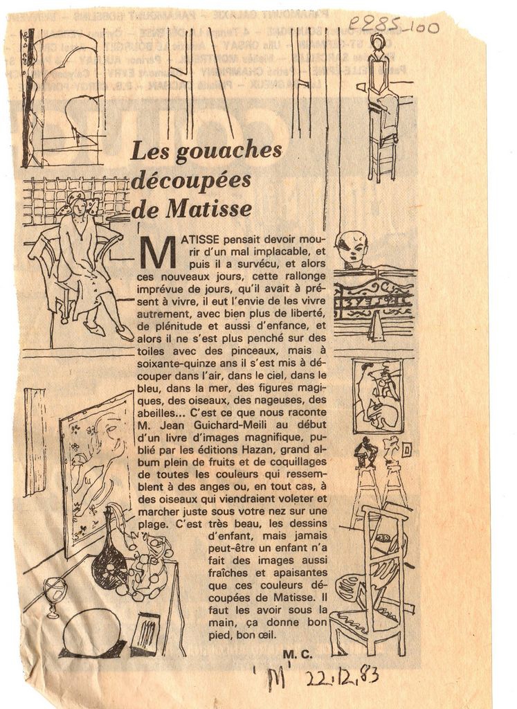 Απόκομμα, χαρτί, 18×12 εκ., στα γαλλικά, δημοσίευσης άρθρου το οποίο αναφέρεται σε κυκλοφορία βιβλίου του Jean Guichard-Meili, αφιερωμένου στα χαρακτικά του Henri Matisse, το οποίο κυκλοφορεί από τις εκδόσεις Hazan.