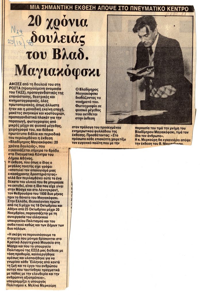 Απόκομμα, χαρτί ακανόνιστου μεγέθους, στα ελληνικά, δημοσίευσης άρθρου αναφερόμενου σε έκθεση αφιερωμένη στον Βλαδίμηρο Μαγιακόφσκι, η οποία διεξάγεται στο Πνευματικό Κέντρο του Δήμου Αθηναίων. Αναγράφονται λεπτομέρειες.