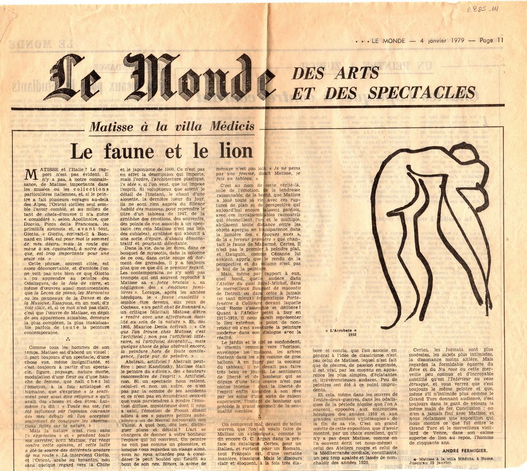Απόκομμα, χαρτί, 28×33 εκ., στα γαλλικά, δημοσίευσης κριτικής έκθεσης Henri Matisse, η οποία διεξάγεται στην Villa Medicis στη Ρώμη. Σχολιάζεται η παρουσία του καλλιτέχνη στα εικαστικά δρώμενα της χώρας.