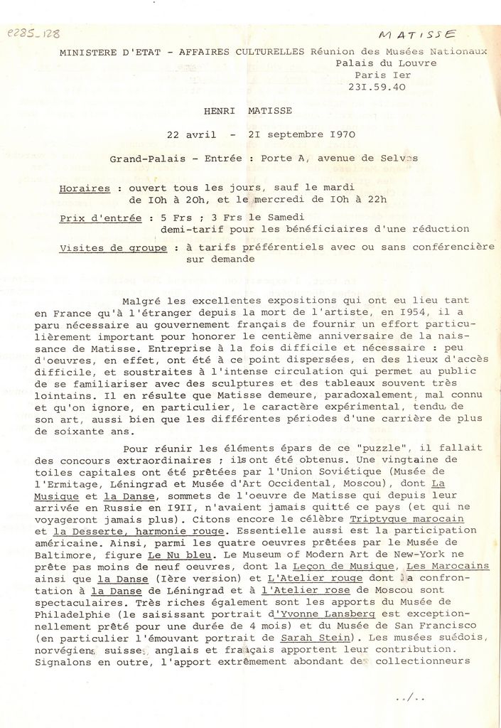 Φωτοαντίγραφο, χαρτί, 2 φφ, στα γαλλικά, δελτίου τύπου έκθεσης Henri Matisse, η οποία διεξάγεται στο Grand Palais στο Παρίσι. Αναγράφονται λεπτομέρειες για τη διοργάνωση της έκθεσης και τα έργα που παρουσιάζονται σε αυτή. Στο ίδιο, κατάλογος έργων σε αντιστοιχία με τις συλλογές απ’ όπου προέρχονται.