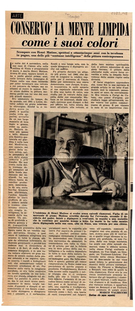 Απόκομμα, χαρτί, 35×16 εκ., στα ιταλικά, δημοσίευσης άρθρου αφιερωμένου στη ζωή και στο εικαστικό έργο του Henri Matisse, με αφορμή τον θάνατο του καλλιτέχνη.