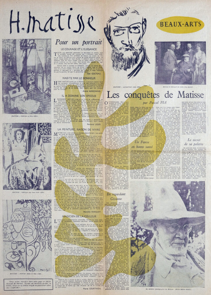 Απόκομμα, χαρτί, 60×43 εκ., στα γαλλικά, δημοσίευσης αφιερώματος του εντύπου στο εικαστικό έργο του Henri Matisse. Αναγράφονται κρίσεις των Jean Cocteau, André Marchand, Fernand Léger και Pierre Courthion για τον καλλιτέχνη και το έργο του.