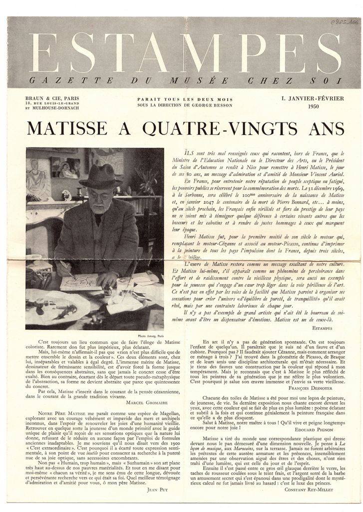Απόκομμα, χαρτί, 2 φφ, 37×27 εκ., στα γαλλικά, δημοσίευσης αφιερώματος στον Henri Matisse, με αφορμή την συμπλήρωση 80 χρόνων από τη γέννησή του. Αναγράφονται κρίσεις των M. Gromaire, J. Puy, F. Desnoyer, E. Pignon, C. Rey-Millet, J.-R. Bazaine για τον καλλιτέχνη και το έργο του.