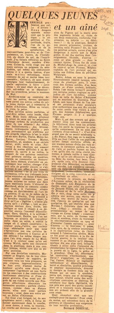 Απόκομμα, χαρτί, 34×13 εκ., στα γαλλικά, δημοσίευσης άρθρου το οποίο αναφέρεται στο Salon d’ Automne 1945. Μεταξύ άλλων σχολιάζεται η συμμετοχή του Henri Matisse με έργα του.