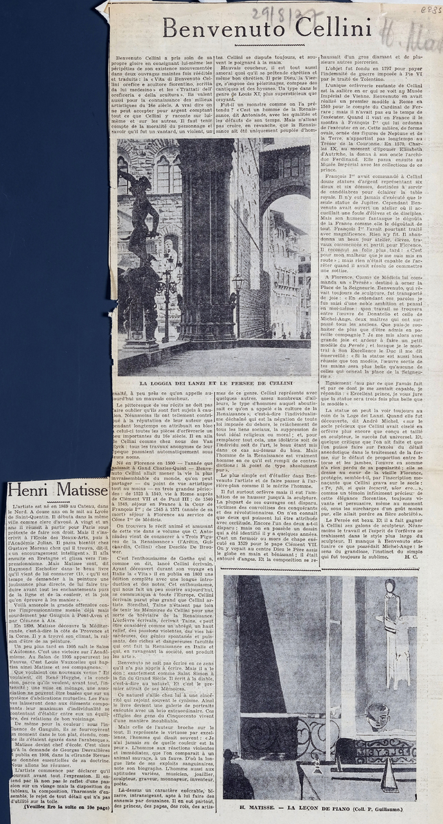 Απόκομμα, 48,5×26 εκ., στα γαλλικά, δημοσίευσης άρθρου αφιερωμένου στο εικαστικό έργο του Henri Matisse. Σχολιάζονται έργα του καλλιτέχνη και οι επιρροές του.