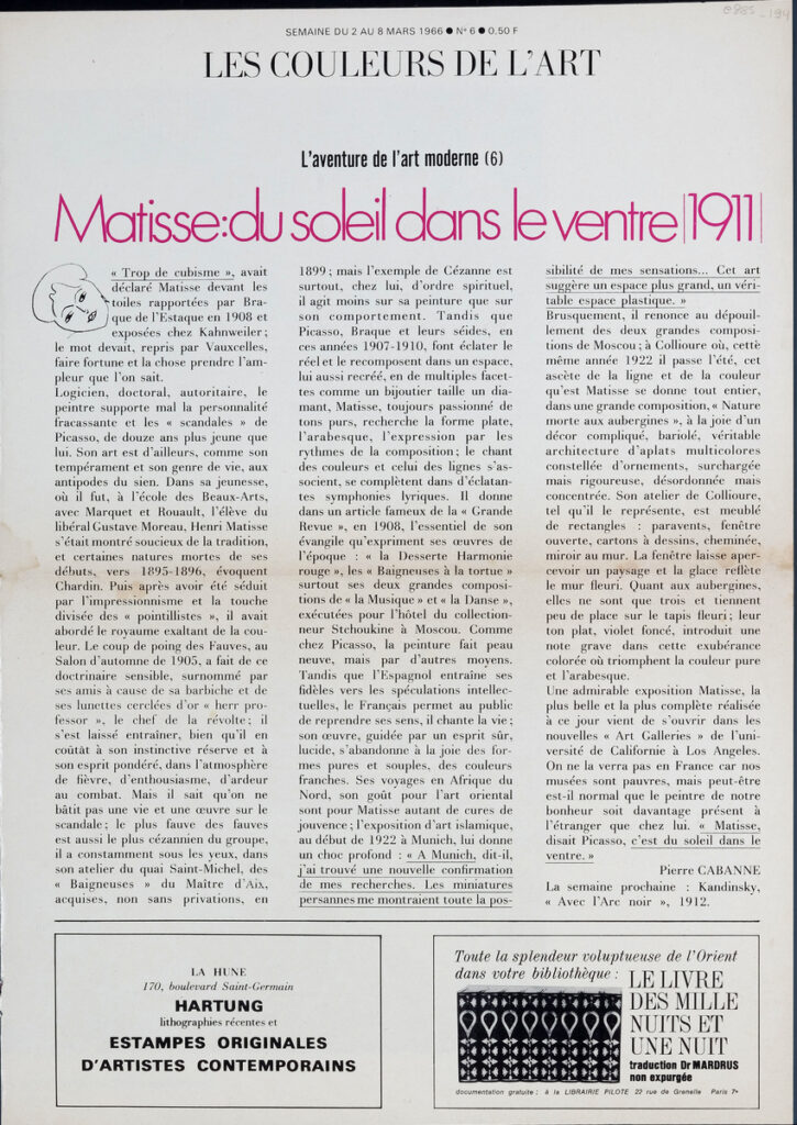 Απόκομμα, χαρτί, δισέλιδο, 40×28 εκ., στα γαλλικά, δημοσίευσης άρθρου αφιερωμένου στο εικαστικό έργο του Henri Matisse. Σχολιάζονται έργα του καλλιτέχνη και γίνεται αναφορά σε αναδρομική έκθεση στην “Art Galleries” του Πανεπιστημίου της Καλιφόρνια.