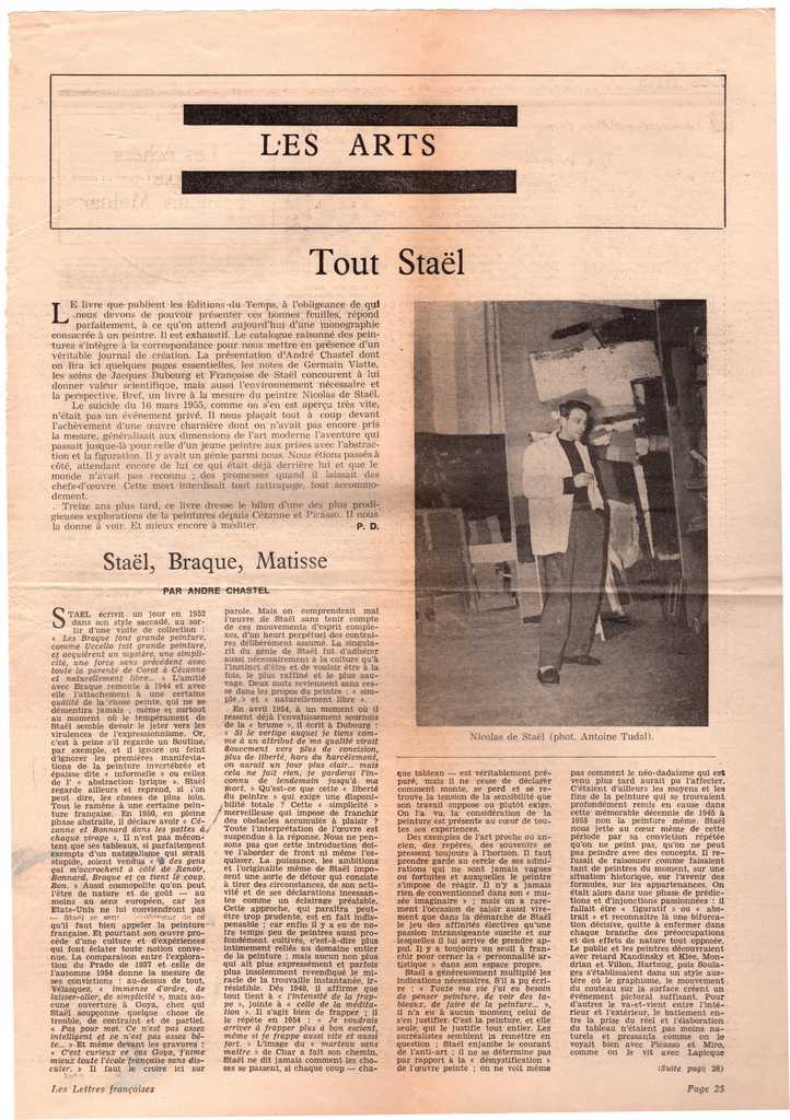 Απόκομμα, χαρτί διπλής όψης, 42×30 εκ., στα γαλλικά, δημοσίευσης άρθρου το οποίο αναφέρεται στη σχέση των N. de Staël με τους G. Braque και H. Matisse. Αναγράφονται σχόλια του καλλιτέχνη για τους ομοτέχνους του. Επίσης, γίνεται αναφορά σε κυκλοφορία βιβλίου για τον καλλιτέχνη.