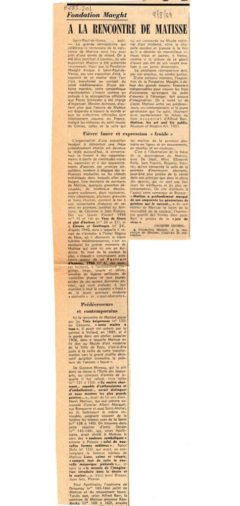 Απόκομμα, χαρτί ακανόνιστου μεγέθους, στα γαλλικά, δημοσίευσης κριτικής έκθεσης Henri Matisse, η οποία διεξάγεται στην Fondation Maeght στην Saint Paul de Vence. Σχολιάζονται έργα του καλλιτέχνη.