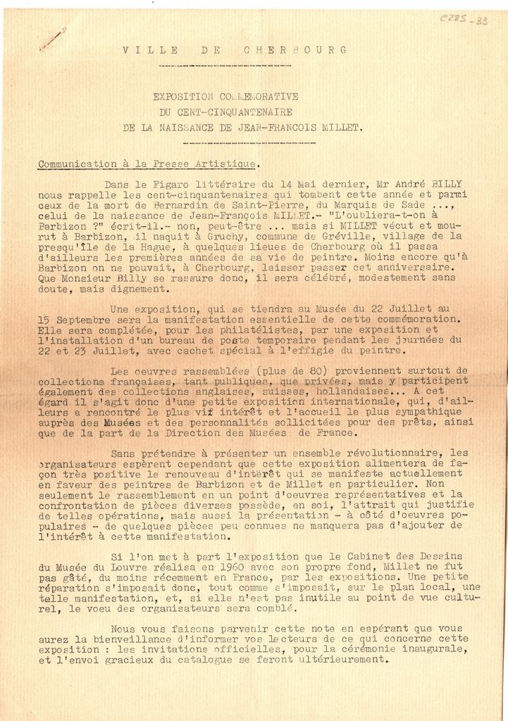 Δακτυλόγραφο δελτίου τύπου, χαρτί, 6 φφ, 31×21 εκ., στα γαλλικά, έκθεσης Jean François Millet, η οποία διεξάγεται στο μουσείο Thomas Henry στο Cherbourg, στο πλαίσιο αφιερώματος στον καλλιτέχνη με αφορμή την συμπλήρωση 150 χρόνων από τον θάνατό του. Αναγράφονται λεπτομέρειες για τη διοργάνωση και δίνεται βιογραφικό σημείωμα του καλλιτέχνη και κείμενα για έργα του.