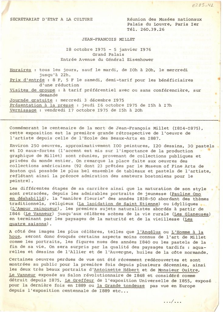 Δακτυλόγραφο, χαρτί διπλής όψης, 30×21 εκ., στα γαλλικά, δελτίο τύπου, αναδρομικής έκθεσης J. -F. Millet, η οποία διεξάγεται στο Grand Palais, με αφορμή την συμπλήρωση 150 χρόνων από τη γέννηση του καλλιτέχνη. Αναγράφονται πληροφορίες και λεπτομέρειες για την διοργάνωση και το περιεχόμενό της.