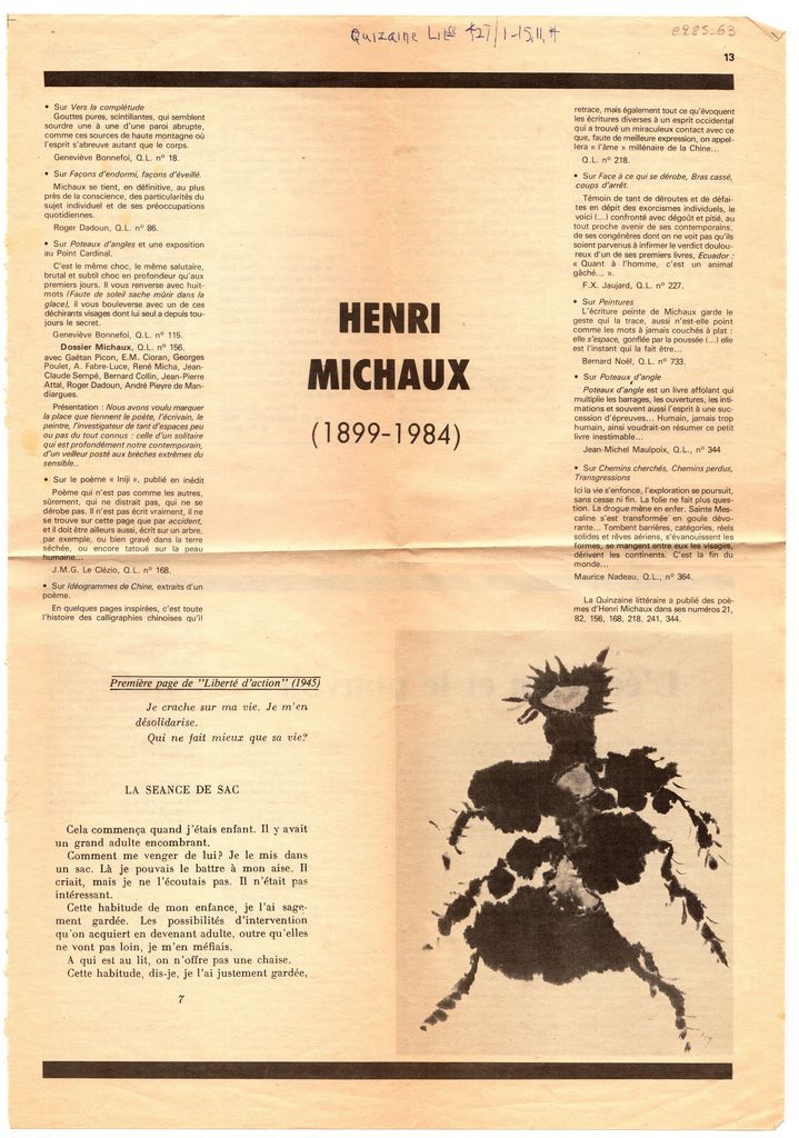 Απόκομμα, χαρτί, 36×25 εκ., στα γαλλικά, δημοσίευσης άρθρου το οποίο περιέχει κριτικές ποιημάτων του Henri Michaux και απόσπασμα κειμένου του με τίτλο “La séance de sac”. Δημοσιεύτηκε με αφορμή τον θάνατο του καλλιτέχνη.