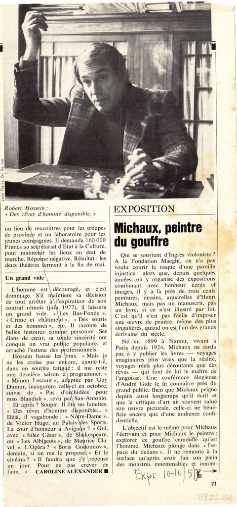 Απόκομμα, χαρτί διπλής όψης, 28×13.5 εκ., στα γαλλικά, δημοσίευσης κριτικής αναδρομικής έκθεσης ζωγραφικής Henri Michaux, η οποία διεξάγεται στην Fondation Maeght. Αναγράφονται λεπτομέρειες και σχόλια για τα έργα του καλλιτέχνη που παρουσιάζονται σε αυτή.