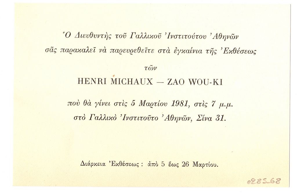 Πρόσκληση, χαρτόνι διπλής όψης, 9.5×14.5 εκ., στα ελληνικά και γαλλικά, εγκαινίων ομαδικής έκθεσης των Henri Michaux και Zao Wou-Ki, οι οποία διεξάγεται στο Γαλλικό Ινστιτούτο Αθηνών.
