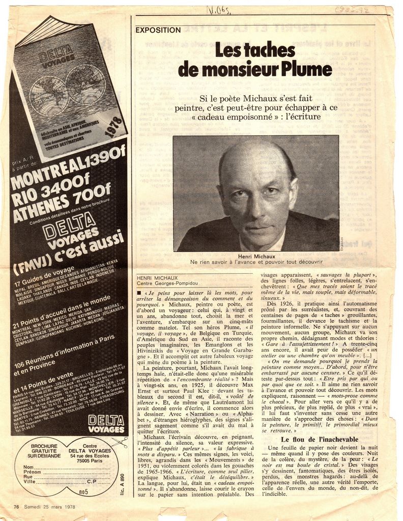 Απόκομμα, χαρτί, 2 φφ, 30×23.5 εκ., στα γαλλικά, δημοσίευσης κριτικής αναδρομικής έκθεσης Henri Michaux, η οποία διεξάγεται στο Centre Pompidou στο Παρίσι.