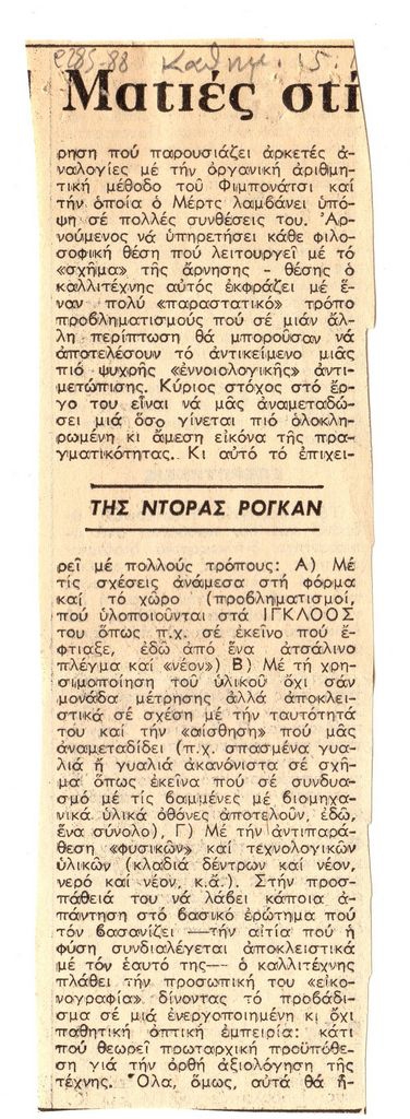 Απόκομμα, χαρτί συρραμμένο σε έντυπο, 21×11 εκ., στα ελληνικά, δημοσίευσης κριτικής έκθεσης του Mario Merz, η οποία διεξάγεται στην γκαλερί Jean & Karen Bernier στην Αθήνα.